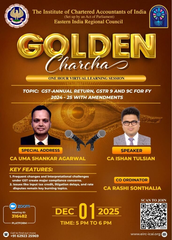 This technical session under the Golden Charcha series, organised by the Eastern India Regional Council (EIRC) of ICAI, focused on GST Annual Return – GSTR-9 & GSTR-9C for FY 2024-25 (with Amendments).